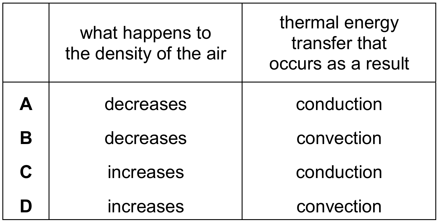 When air is heated, the particles gain kinetic energy and move further apart, causing the air to expand. Since the same mass now occupies a larger volume $V$, the density $\rho$ decreases according to $\rho = \frac{m}{V}$. This less dense, warmer air rises while cooler, denser air sinks to take its place. This bulk movement of fluid caused by density differences is the primary mechanism of thermal energy transfer in gases known as convection. Therefore, the density decreases and the resulting transfer is convection, as shown in Row B.