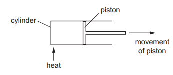 The diagram shows a frictionless piston inside a cylinder. The air inside the cylinder is heated. The piston moves in the direction shown