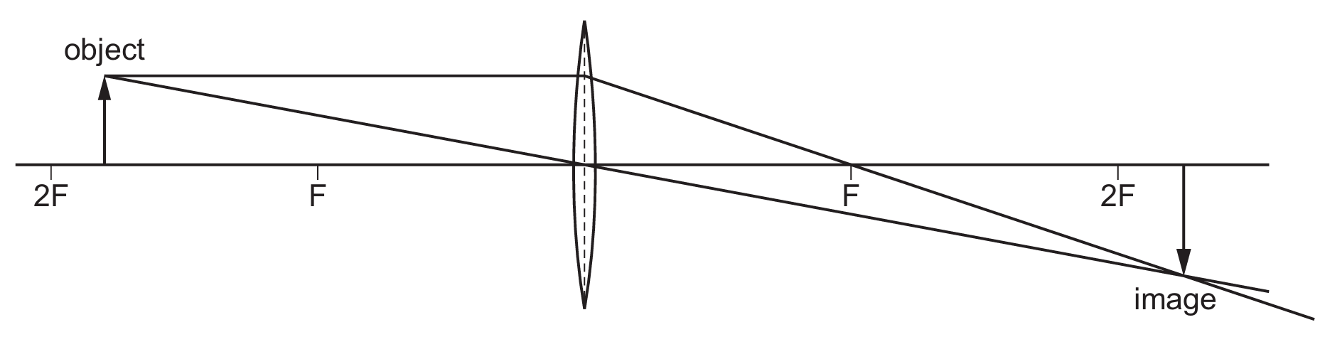 The ray diagram shows light rays originating from the object, passing through the lens, and actually intersecting at a point on the opposite side. Because the rays physically meet, the image is real and can be projected onto a screen. The resulting image arrow points downwards, opposite to the orientation of the object, confirming it is inverted. Visually, the image is also larger than the object, making it enlarged, though only “real and inverted” are required to identify the correct row. Therefore, the terms that accurately describe this image are real and inverted.
