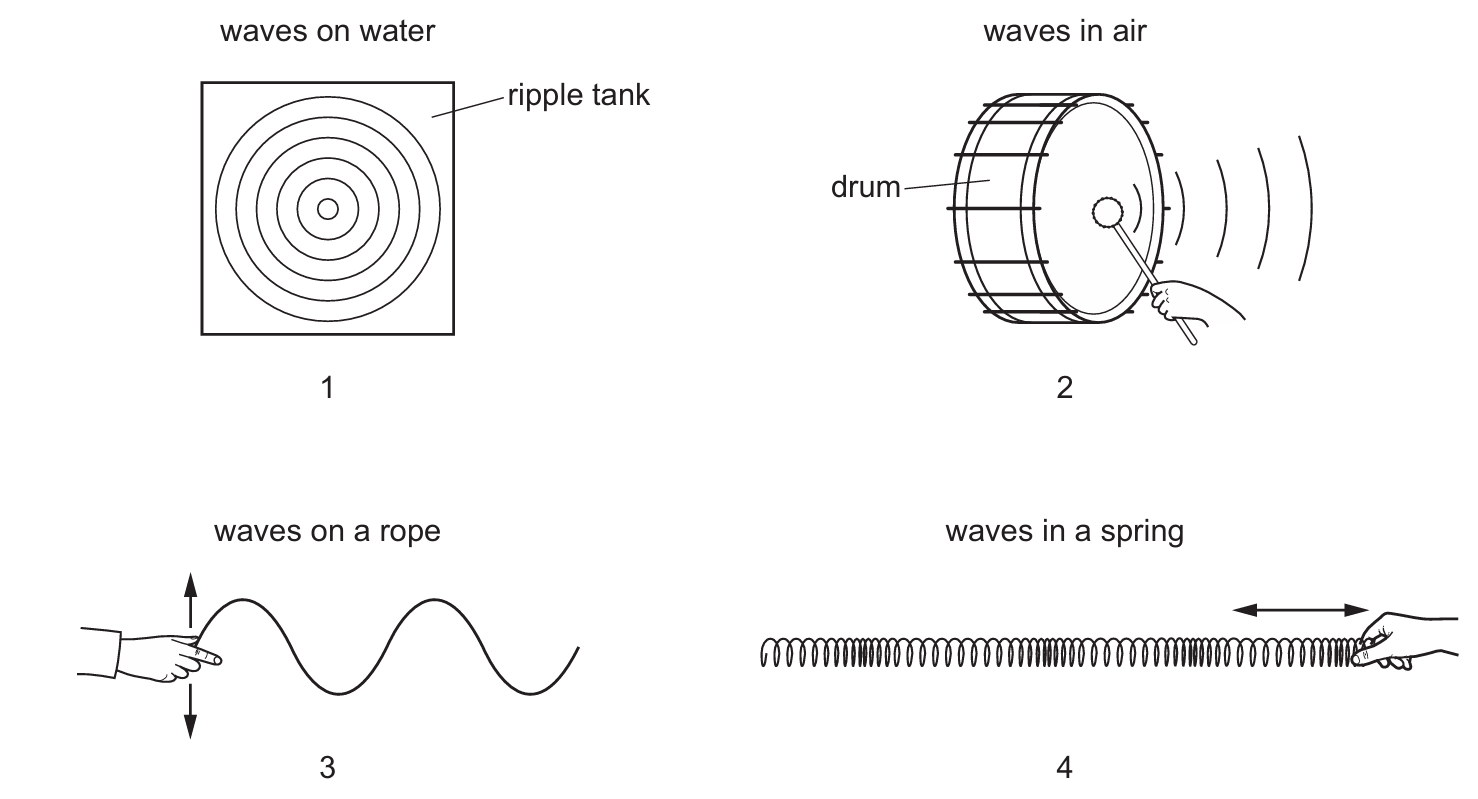 In longitudinal waves, particles vibrate parallel to the direction of wave travel. Diagram 2 represents sound waves in air, which are always longitudinal as they consist of compressions and rarefactions. Diagram 4 shows a spring being pushed and pulled horizontally, creating vibrations parallel to the energy transfer. Conversely, water waves (Diagram 1) and waves on a rope (Diagram 3) are transverse, where vibrations occur at $90^\circ$ to the direction of propagation. Therefore, only examples 2 and 4 describe longitudinal motion.