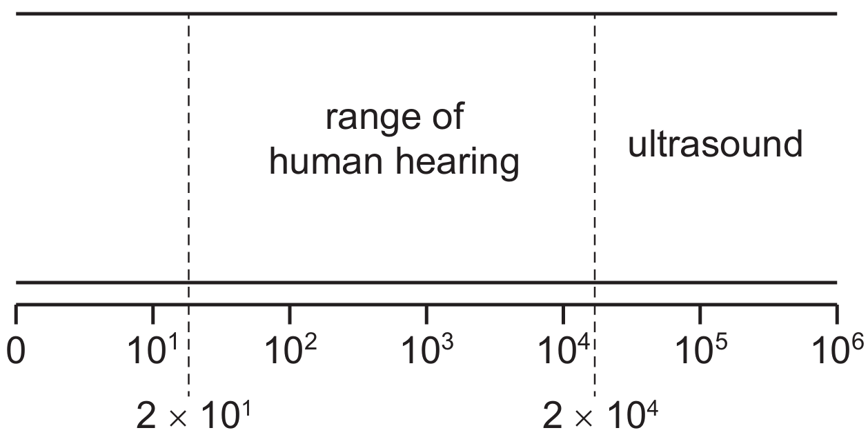 The diagram illustrates the limits of the human auditory system and the start of the ultrasound region.