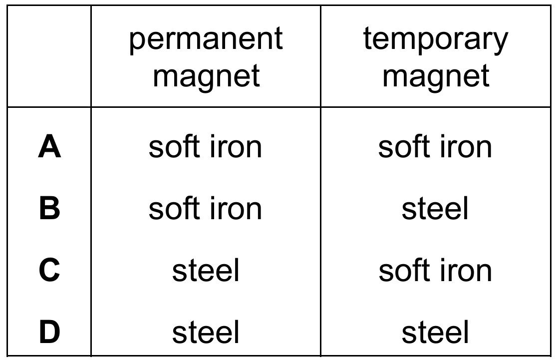 Magnetic materials are classified by how easily they can be magnetized and demagnetized. Steel is a “hard” magnetic material; it is difficult to magnetize but retains its magnetism well, making it ideal for permanent magnets. Soft iron is a “soft” magnetic material; it magnetizes easily but loses its magnetism almost immediately when the external magnetic field is removed. This property makes soft iron the standard choice for temporary magnets, such as the cores of electromagnets. Therefore, Row $C$ correctly identifies that permanent magnets are made of steel and temporary magnets are made of soft iron.
