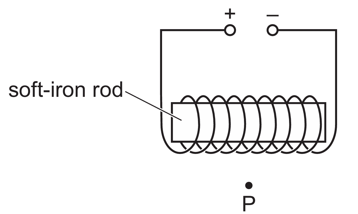 The diagram shows a coil of insulated wire wrapped around a soft-iron rod.