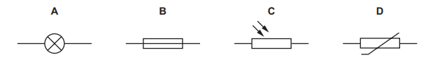 The second component in circuits A and C is a Light-Dependent Resistor (LDR), indicated by incoming arrows representing light.