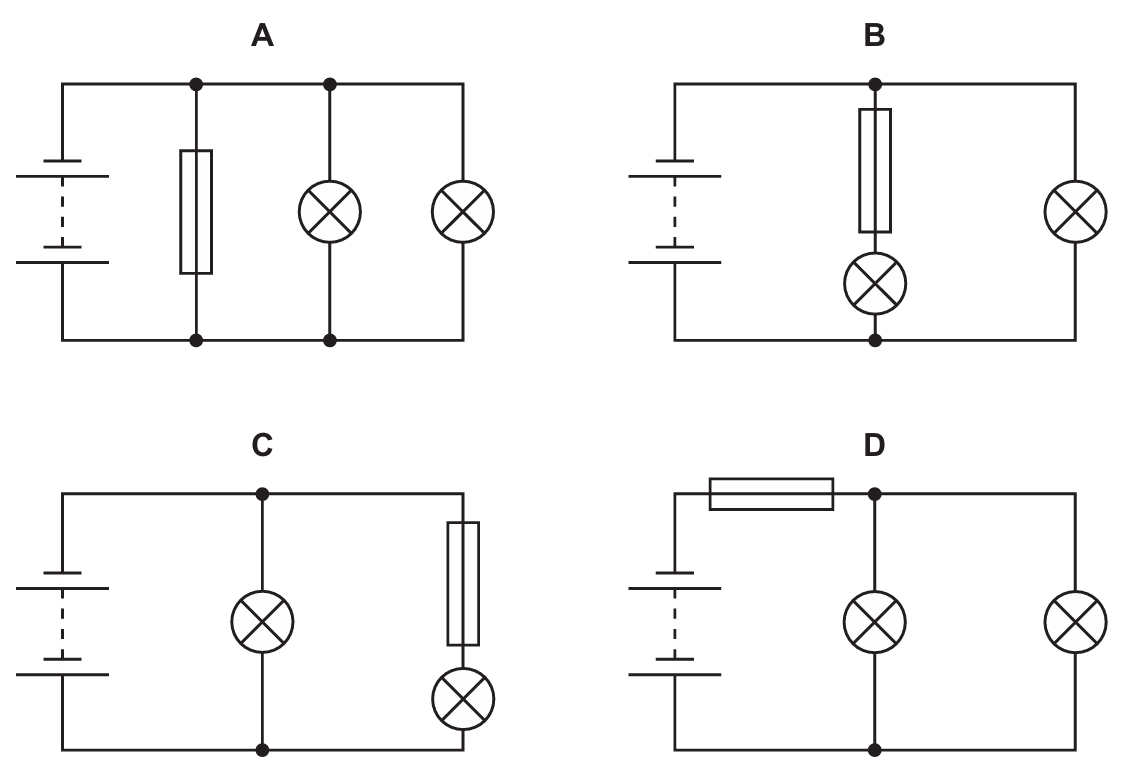 A fuse is a safety device designed to break the circuit by melting when the current exceeds a specific limit. For a fuse to cause all components in a circuit to turn off, it must be placed in the main branch where the total current $I_{total}$ flows. In circuits A, B, and C, the fuse is placed in parallel branches; if it blows, current can still flow through the other available paths to the remaining lamps. In circuit D, the fuse is connected in series with the battery before the parallel junction. If this fuse blows, it creates an open circuit, meaning $I = 0~A$ throughout the entire system, causing both lamps to go out immediately.