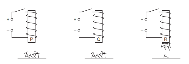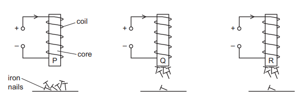 Three cores of different metals P, Q and R are placed inside identical coils of wire.
