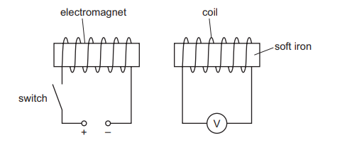 The diagram shows an electromagnet near a coil of wire connected to a voltmeter. The reading on the voltmeter is zero.