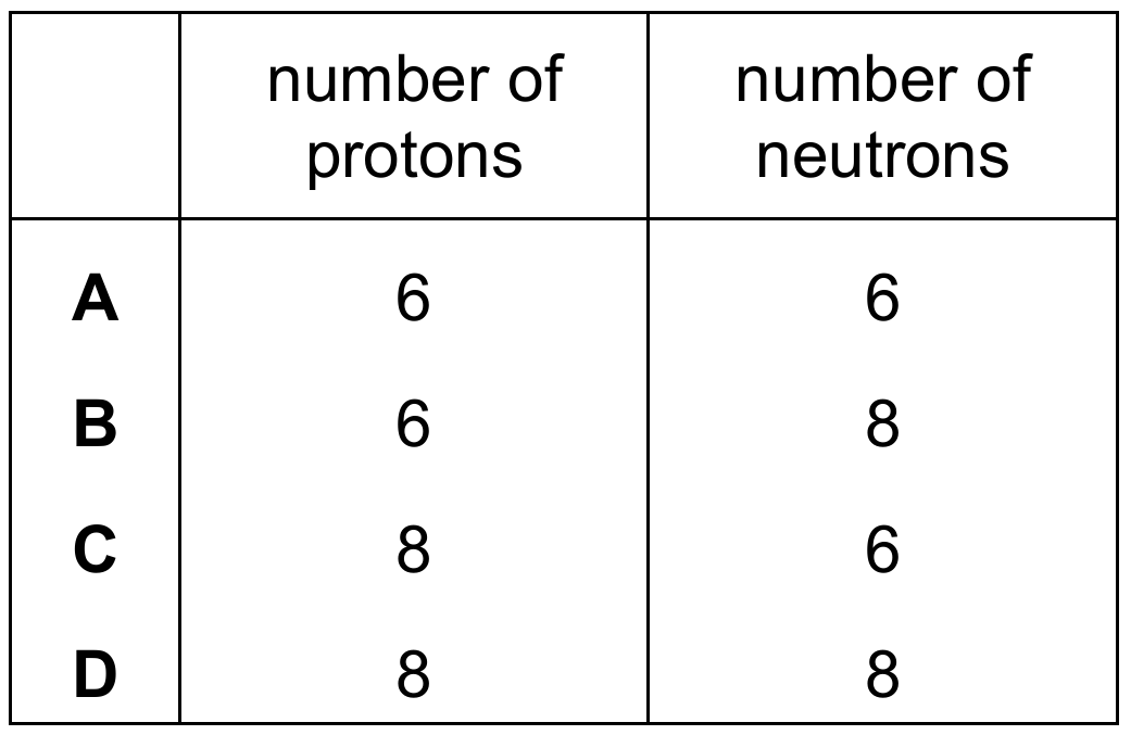 Thus, the nucleus contains $6$ protons and $8$ neutrons, matching the values provided in Row B.