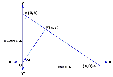 If a line is at perpendicular distance \( p \) from origin and makes angle \( \alpha \) with the positive X-axis: