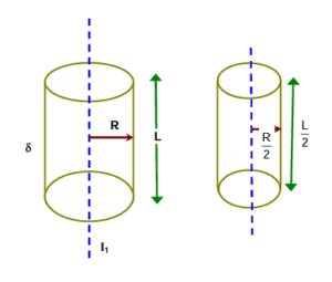 I1 =\((\frac{1}{2})MR²\) = \( (\frac{1}{2})ρπR²L × R²\) =\( (\frac{1}{2})ρπR⁴L\)