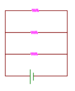 Equivalent resistance: \( \frac{1}{R_{eq}} = \frac{1}{12} + \frac{1}{12} + \frac{1}{12} = \frac{3}{12} = \frac{1}{4} \) ⇒ \( R_{eq} = 4 \Omega \)