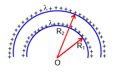 \( V = \frac{K(\lambda \pi R_1)}{R_1} + \frac{K(\lambda \pi R_2)}{R_2} = 2K\lambda\pi = \frac{\lambda}{2\varepsilon_0} \)