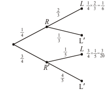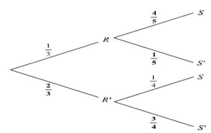 P(R) = \(\frac{1}{3}\), P(S | R) = \(\frac{4}{5}\) , P(S | R′) = \(\frac{1}{4}\).