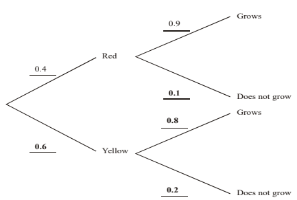 6. A packet of seeds contains \(40\)% red seeds and \(60\)% yellow seeds. The probability that a red seed grows is \(0.9\), and that a yellow seed grows is \(0.8\). A seed is chosen at random from