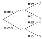 \(p(D|S)\) = \(\frac{0.0001\times 0.99}{0.0500939} = 0.00198\) (\(3\)s.f.)