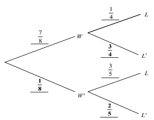 (c) \(P(W|L) = \(\frac{P(W\cap L)}{P(L)}\) \( P(W\cap L) = \frac{7}{8}\times \frac{1}{4}\) \(P(L) = \frac{47}{160}\)