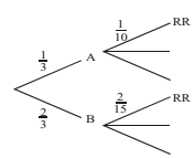 \(P(RR) = \frac{1}{3}\times \frac{1}{10}+\frac{2}{3}\times \frac{2}{15} = \frac{11}{90}\)