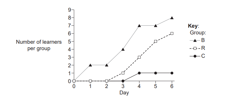 • Difference: Group B begins gaining learners immediately, while group R does not produce any learners until day 3. Group B consistently has more learners than group R throughout the period.