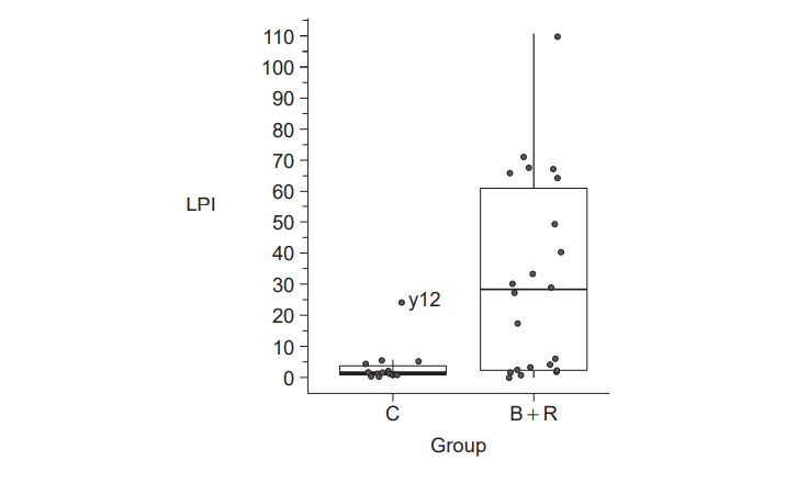 The LPIs for learners in both B and R groups were combined (\(B+R\)).
