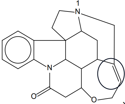Moles of strychnine: \[ n = \frac{48.73}{334.4} = 0.1457\,\text{mol} \] Reaction ratio: \(2\) mol strychnine produce \(1\) mol sulfate product. \[ n(\text{product}) = \frac{0.1457}{2} = 0.07286\,\text{mol} \] Using section \(7\) of the data booklet: \[ M_r(\mathrm{H_2SO_4}) = 2(1.01) + 32.07 + 4(16.00) = 98.08 \] Molar mass of sulfate product: \[ M_r = 2(334.4) + 98.08 = 766.88\,\text{g mol}^{-1} \] Theoretical mass of product: \[ m = 0.07286 \times 766.88 = 55.88\,\text{g} \] Percentage yield: \[ \%\,\text{yield} = \frac{51.41}{55.88} \times 100 = \boxed{92.00\%} \]