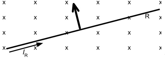 Using Fleming’s left-hand rule: current (right), magnetic field (into page) ⇒ force direction is upwards (perpendicular to both).