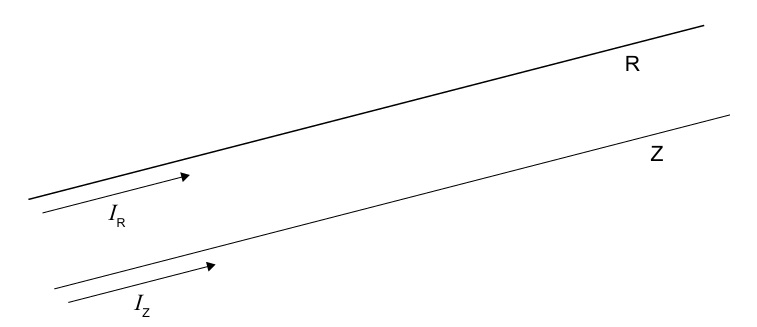 Here, the field at wire Z due to current \(I_R\) in R is: