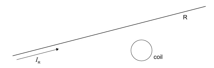 The magnetic field produced by the straight wire R at the coil’s position is constant when \(I_R\) is constant. Therefore, the magnetic flux through the coil is constant. By Faraday’s law, an emf (and hence current) is induced only when the flux is changing.
