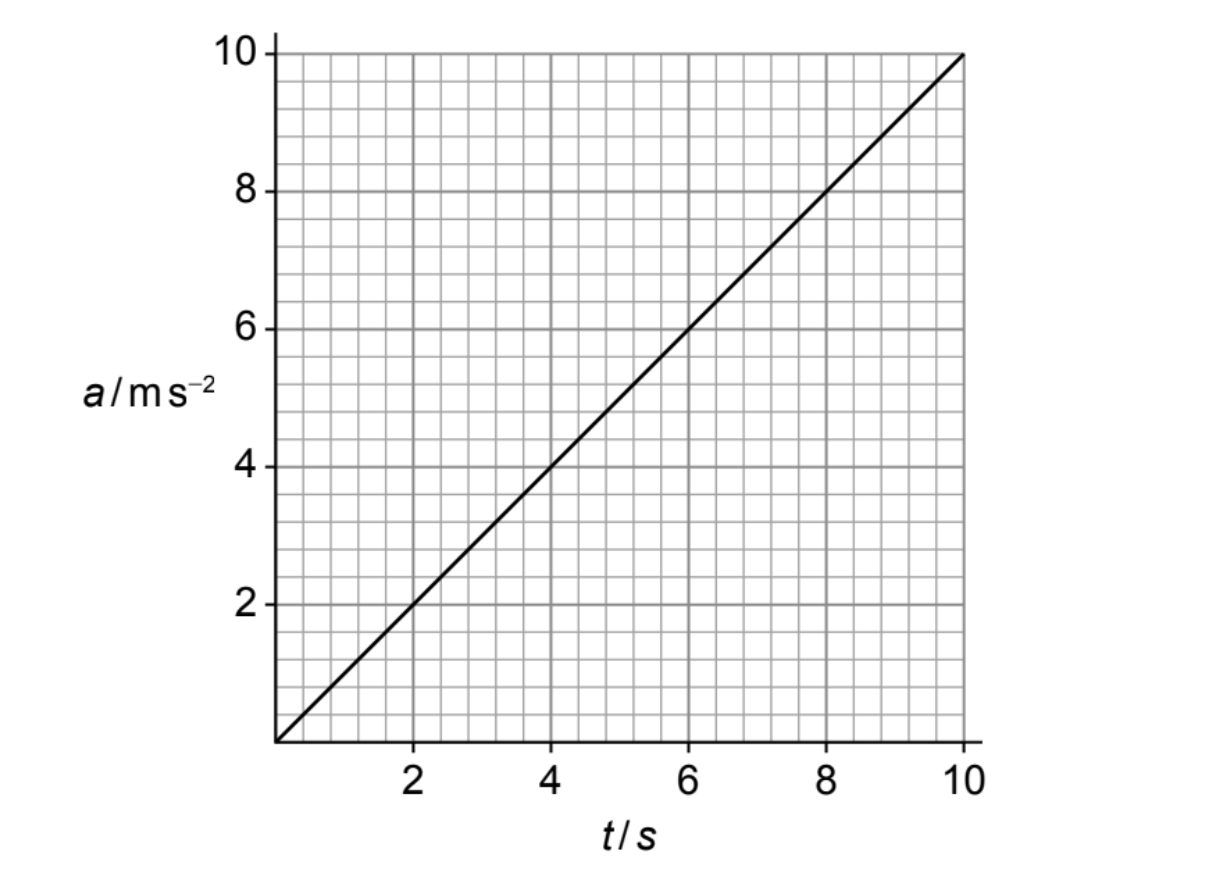 The graph is a straight line passing through the origin. At \(t=8.0\) s, read the acceleration from the graph. It corresponds to \(a=8.0\) ms\(^{-2}\).