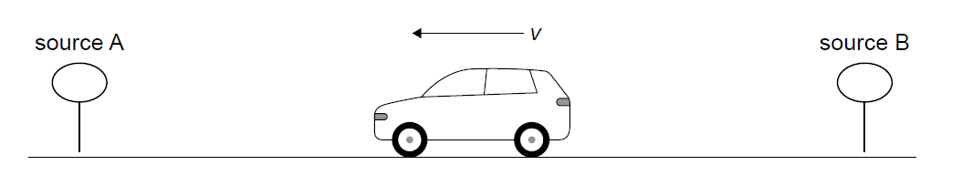 A car is moving at constant velocity \(v\) between two sources of sound as shown in the diagram. The sources emit sound at \(440\,\text{Hz}\) and at \(540\,\text{Hz}\). The driver hears both sounds at the same frequency.