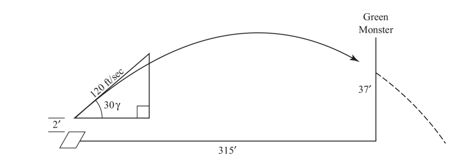 The Boston Red Sox play in Fenway Park, notorious for its Green Monster, a wall 37 feet tall and 315 feet from home plate at the left-field foul line. Suppose a batter hits a ball 2 feet above home plate, driving the ball down the left-field line at an initial angle of $30^{\circ}$ above the horizontal, with initial velocity of 120 feet per second. (Since Fenway is near sea level, assume that the acceleration due to gravity is $-32.172 \mathrm{ft} / \mathrm{sec}^2$.)