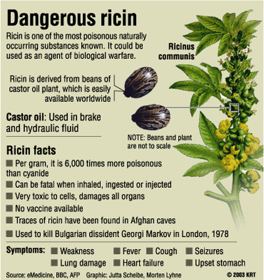 - A few toxins, similar to ricin, are deadly in small amounts; only one milligram of ricin will execute a healthy grown-up human.