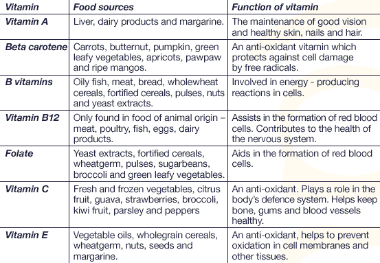 All the vitamins that are needed by the body are tabulated below with their function inside the body and their food sources.