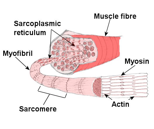Skeletal Muscle is made up of number of muscle bundles also known as Fascicles. Each muscle bundle is made up of number of muscle fibers. Sarcolemma is a type of plasma membrane which lined the muscle fiber. Sarcolemma encloses the sarcoplasm. Muscle fiber is made up of multiple nuclei, so it is known as Syncytium. The endoplasmic reticulum of the muscle fiber is known as Sarcoplasmic Reticulum. Sarcoplasmic Reticulum stores calcium ion that participates in muscle contraction. Muscle fiber contain parallelly arranged filaments known as Myofibrils or Myofilaments. The fibrous tissue that surround the skeletal muscle is known as Epimysium.