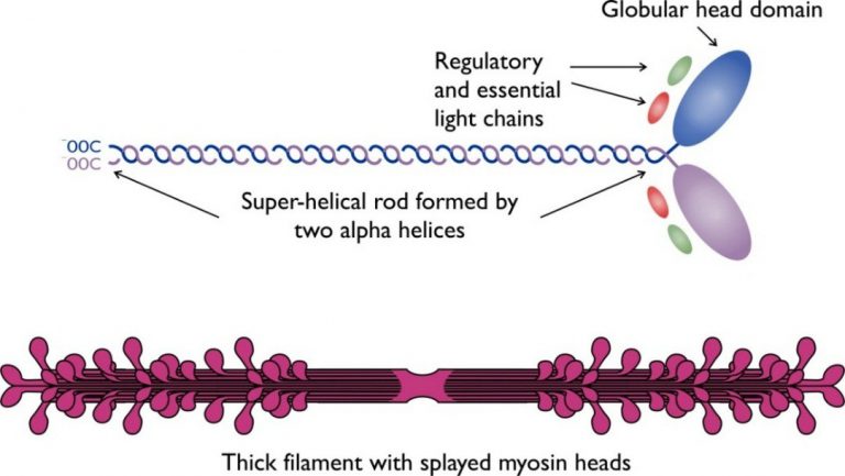 Myosin protein is also made up of monomeric known as Meromyosins. Each meromyosin has two regions: globular head and a long tail.