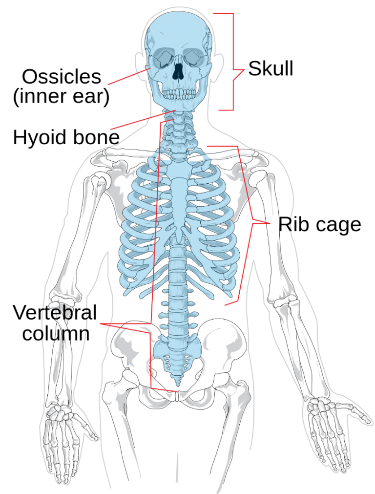 Axial skeletal consists of 80 bones. It consists of skull, sternum, vertebral column, and ribs.