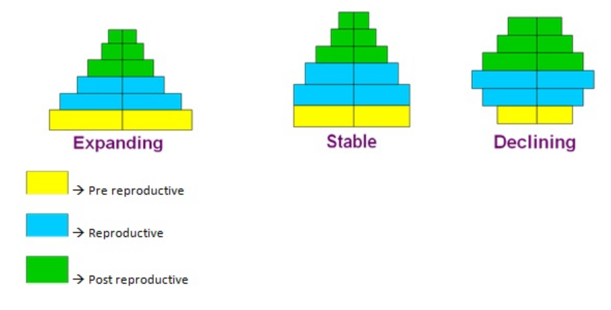 Age pyramids: Indicate growth trends – expanding, stable, declining.