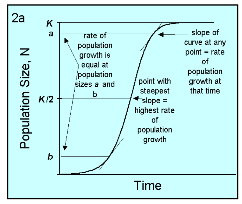 Population growth slows as it approaches carrying capacity (K) → S-shaped (sigmoid) curve.