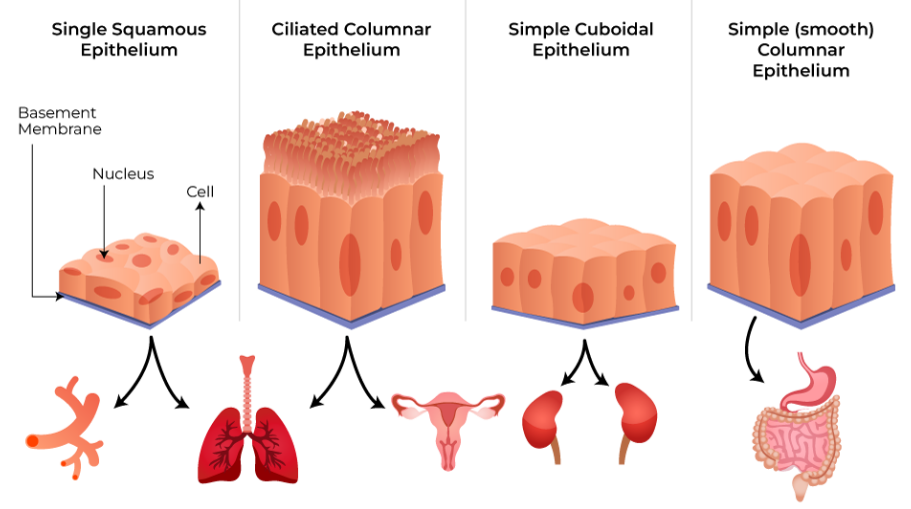 | Simple squamous | Thin, flat single layer | Alveoli, capillaries, Bowman’s capsule | Diffusion, filtration | Pavement epithelium |