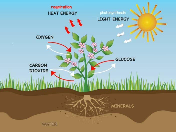 Respiration in plants involves uptake of oxygen (O2) and release of carbon dioxide (CO2).