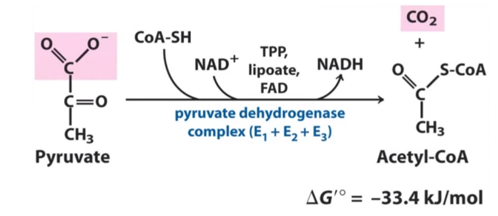 Pyruvate → Acetyl-CoA → 2 NADH → 6 ATP