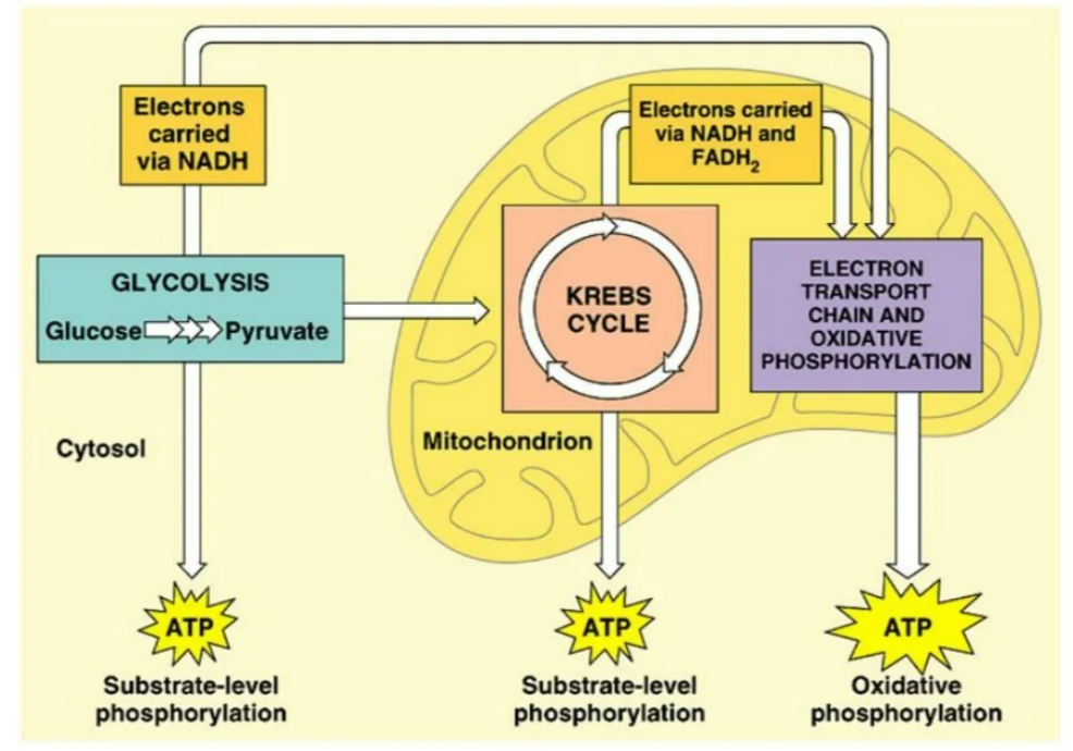 Glycolysis → 2 ATP (substrate level) + 2 NADH → 6 ATP