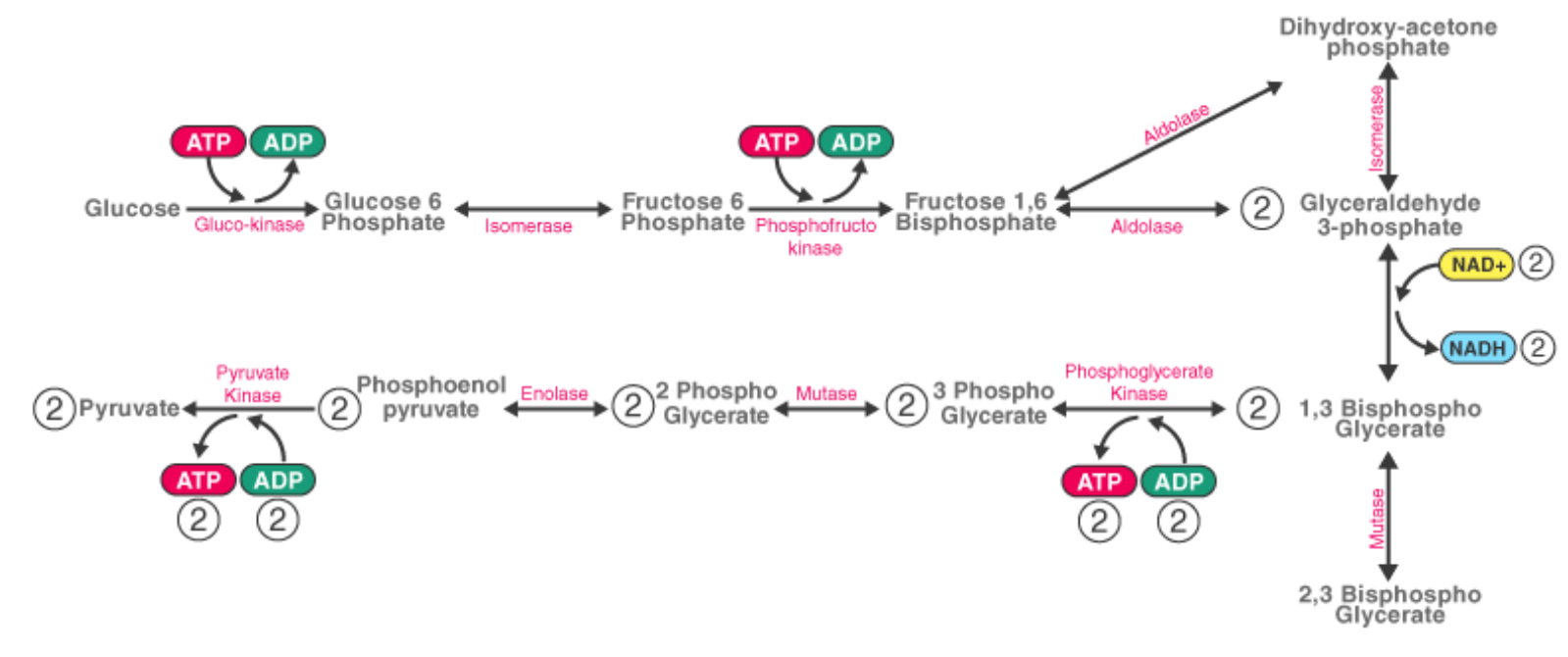 - 1,3-BPG → 3-Phosphoglycerate (Phosphoglycerate kinase → 2 ATP)