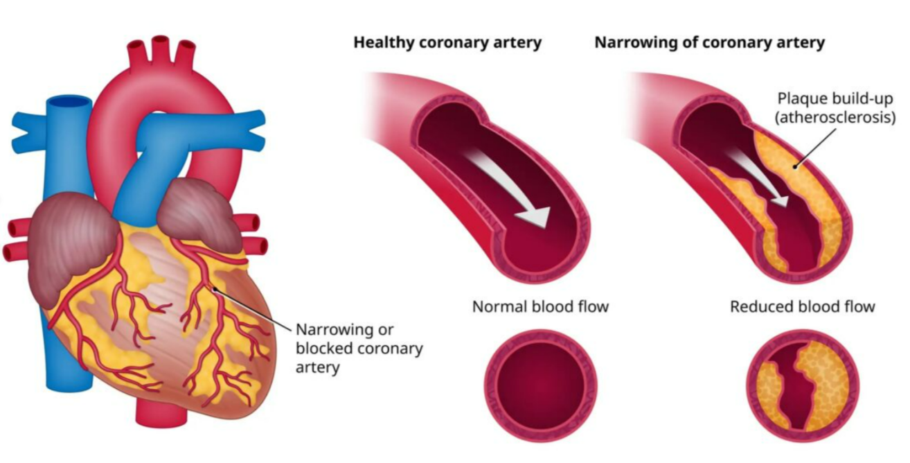 | CAD | Coronary arteries narrow | Fat + cholesterol deposition | Less blood to heart |