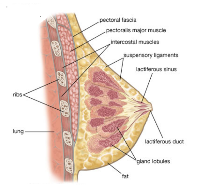 - Alveoli → milk-producing sacs lined by secretory epithelial cells