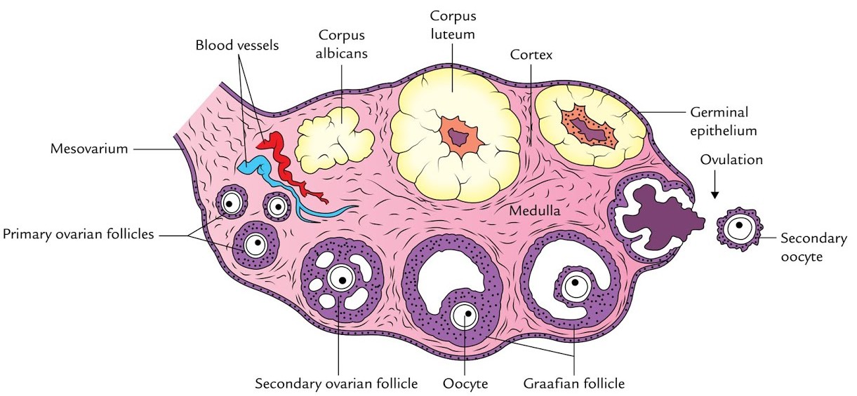 - Hormones: FSH → follicle development, LH → ovulation, estrogen & progesterone → regulate menstrual cycle & pregnancy.