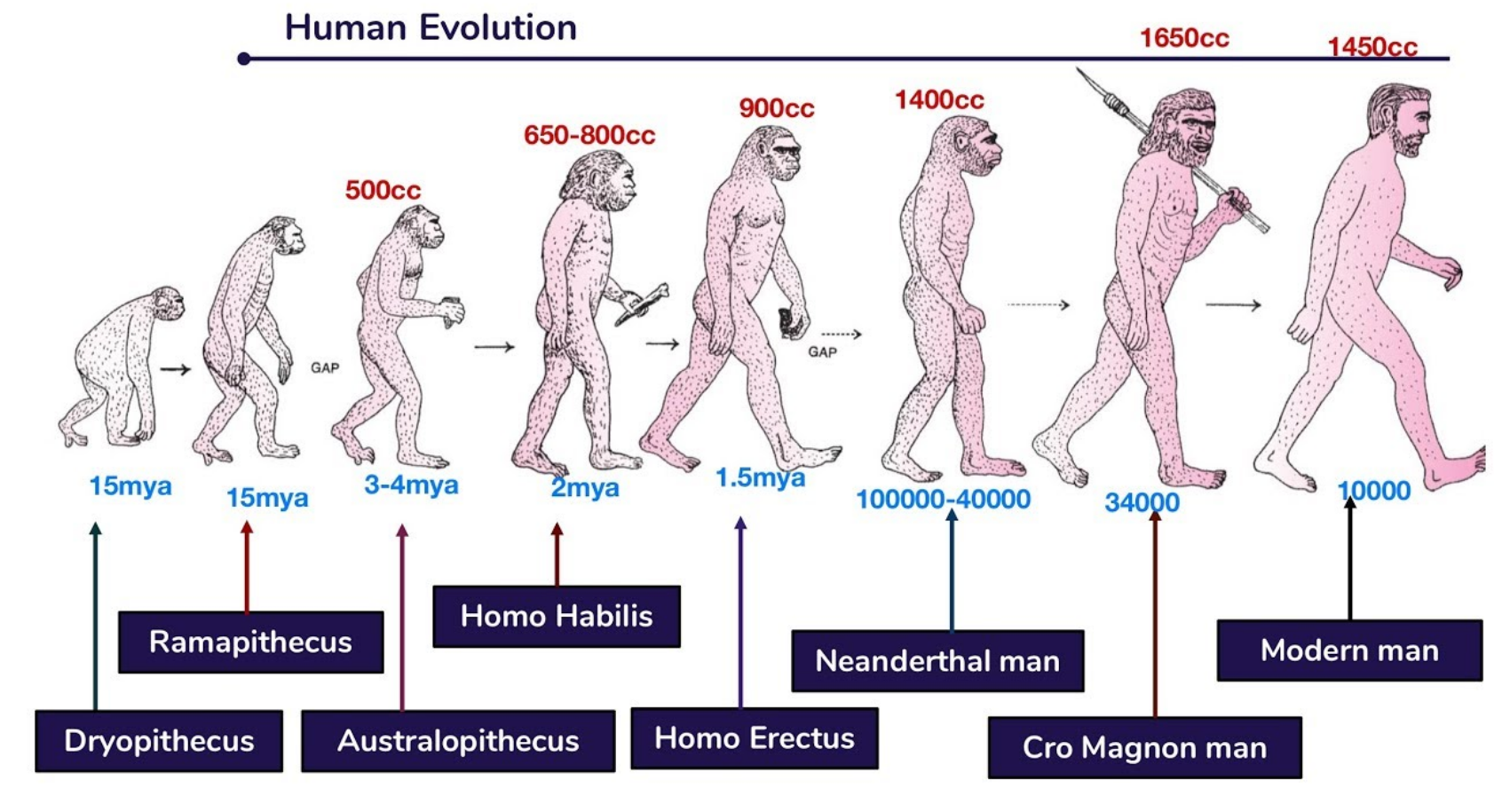Modern humans: Homo sapiens → brain ~1350 cc, culture, language