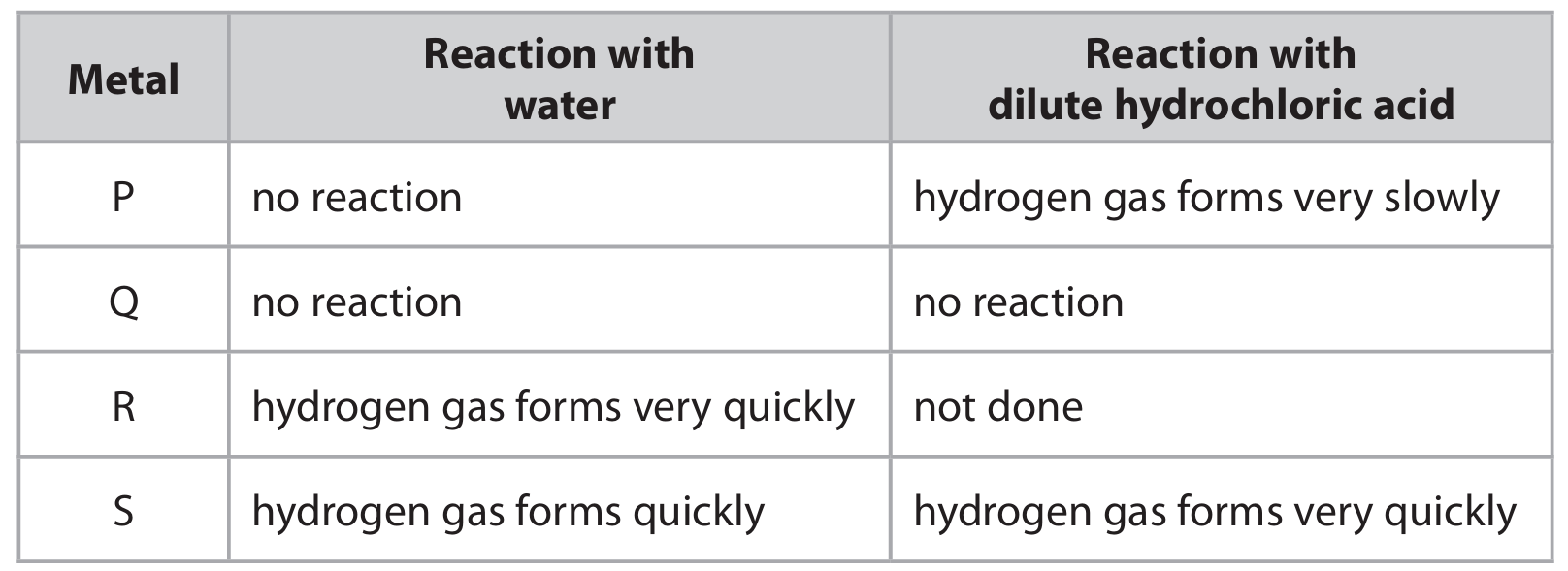 The table shows how four metals, P, Q, R and S, react with water and with dilute hydrochloric acid.