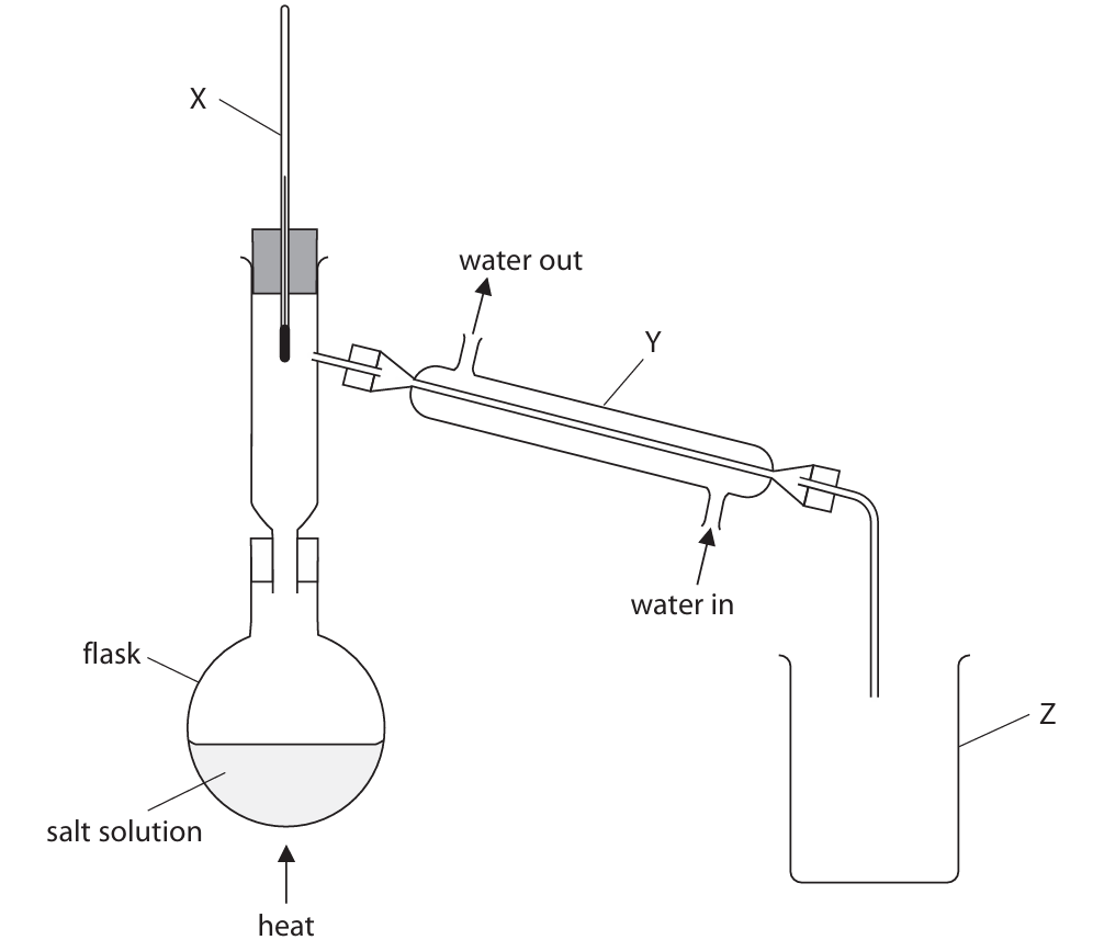 Details: This setup is for simple distillation. The thermometer (X) monitors the boiling point of the vapor. The Liebig condenser (Y) cools and condenses the water vapor back into liquid water. The beaker (Z) collects the pure water distillate.
