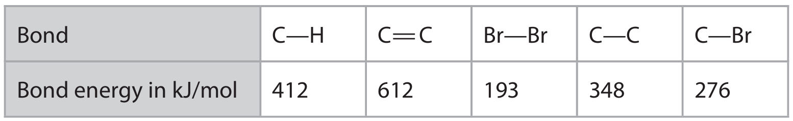 Bonds broken: \(2 \times C=C\) \((2 \times 612)\), \(1 \times C-C\) \((348)\), \(6 \times C-H\) \((6 \times 412)\), \(2 \times Br-Br\) \((2 \times 193)\)