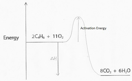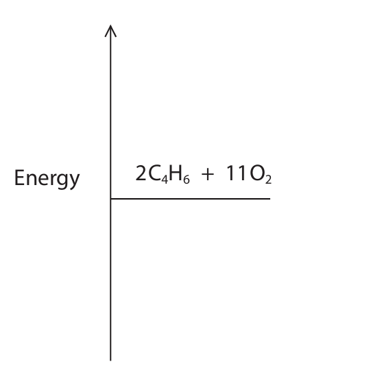 • A horizontal line for reactants \((2C_4H_6 + 11O_2)\) at a higher energy level.